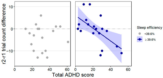 (A) The positive association between the total Attention-Deficit/Hyperactivity Disorder (ADHD) score and the pre-sleep reversal (r1) trial count and (B) no association between the total ADHD score and the post-sleep reversal (r2) trial count. Individual data points and, for the significant effect, the regression line with SE are shown for clearer illustration.