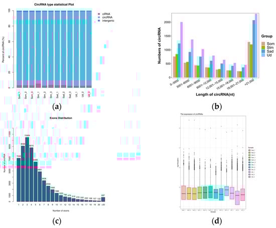 CircRNA identification results revealed that 4587, 3860, 4332, 3167, 6729, 2989, 7025, 6533, 7645, 8564, 11248, and 8435 circRNAs were detected in the 12 samples (Som1, Som2, Som3, Stm1, Stm2, Stm3, Sad1, Sad2, Sad3, Ud1, Ud2, Ud3), respectively. Further analysis of the genomic origins of the identified circRNAs demonstrated that exonic circRNAs constituted the predominant category, followed by intronic ciRNAs and intergeniccircRNAs (Figure 1a). The length of the identified circRNAs primarily ranged between 200 and 20,000 nucleotides (nt) (Figure 1b), and the majority were formed by the circularization of 2 to 4 exons (Figure 1c). Following normalization, the transcript expression levels of circRNAs were comparable across the different groups (Figure 1d).