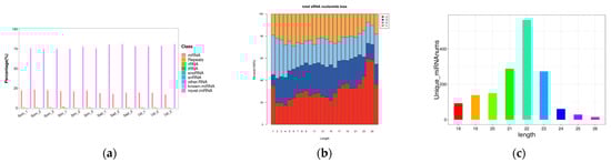 The miRNA annotation results revealed that novel miRNAs constituted the largest proportion, followed by known miRNAs and mRNAs. The proportions of all other types were nearly negligible (Figure 2a). The percentage of total rRNA serves as an indicator of sample quality. High-quality animal samples typically exhibit total rRNA content constituting less than 40% [18]. In this study, the total rRNA content in the different ovarian libraries was close to 0%, indicating exceptionally high sample quality. Furthermore, analysis of the first nucleotide preference for the identified miRNAs demonstrated that both known and predicted miRNAs exhibited a marked preference for uracil (U) at their 5′ termini (Figure 2b). The length distribution of miRNAs was highly consistent across all libraries, ranging predominantly from 20 to 24 nt. The most abundant miRNAs were 22 nt in length, consistent with typical miRNA sizes (Figure 2c).