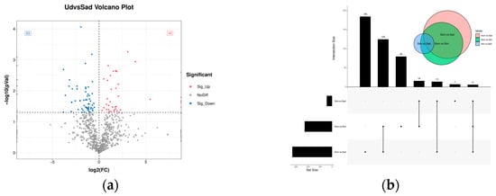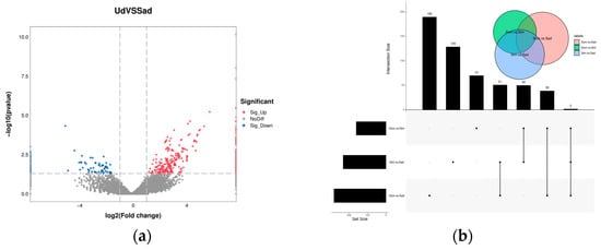 In the differential expression analysis of circRNAs, we identified a total of 517 DECs between the different fertility groups (Sad vs. Ud), comprising 408 up-regulated and 109 down-regulated circRNAs (Figure 3a). For comparisons between different ovarian developmental stages: the Som vs. Stm comparison yielded 161 DECs (77 up-regulated, 84 down-regulated); Stm vs. Sad yielded 232 DECs (50 up-regulated, 182 down-regulated); and Som vs. Sad yielded 282 DECs (53 up-regulated, 229 down-regulated) (Figure 3b). The complete DECs were listed in Supplementary Tables S3–S6.