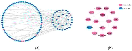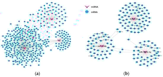 Overview of miRNA and target genes networks. (a): The DEM-DEG interaction network in the Ud vs. Sad group; (b): the DEM-DEG interaction network in the Som vs. Stm vs. Sad group.