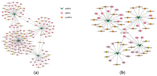 Focusing on DEMs, we integrated DECs acting as miRNA sponges and DEGs targeted by DEMs. DEMs were identified from the intersection of two comparative groups, and a regulatory network was constructed. Due to the excessively large network size, core genes were selected as the intersection of the top 10 miRNAs with the highest interaction probability across relationship pairs. This approach yielded two concise ceRNA networks relevant to our study, as illustrated in Figure 7. The ceRNA network derived from the comparison of different fecundity groups (Ud vs. Sad) comprised 116 DECs, 46 DEMs, and 82 DEGs (Figure 7a). The network obtained from comparing different ovarian developmental stages (Som vs. Stm vs. Sad) consisted of 186 DECs, 143 DEMs, and 338 DEGs, forming a circRNA-miRNA-mRNA regulatory network (Figure 7b).