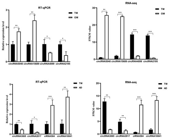 qRT-PCR validation of the RNA-Seq data for circRNAs. (* p < 0.05, ** p < 0.01, *** p < 0.001).