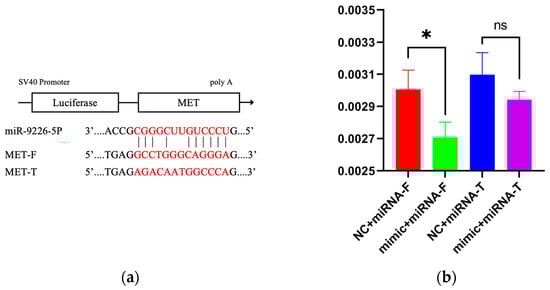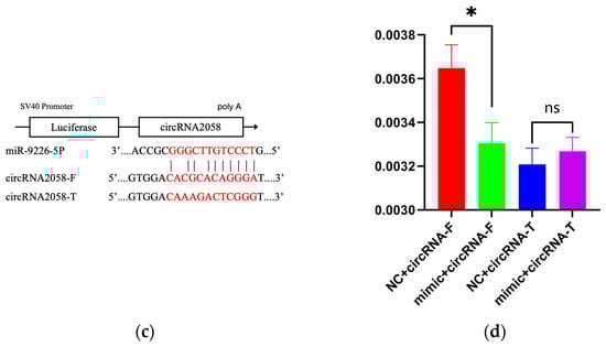 Targeting relationship validation. (a): Complementary nucleotide sequence of MET-3′UTR and miR-9226-5p; (b): MET and miR-9226-5p double luciferase report results; (c): complementary nucleotide sequence of circRNA2058-3′UTR and miR-9226-5p; (d): circRNA2058 and miR-9226-5p double luciferase report results. (* p < 0.05, ns—not significant).