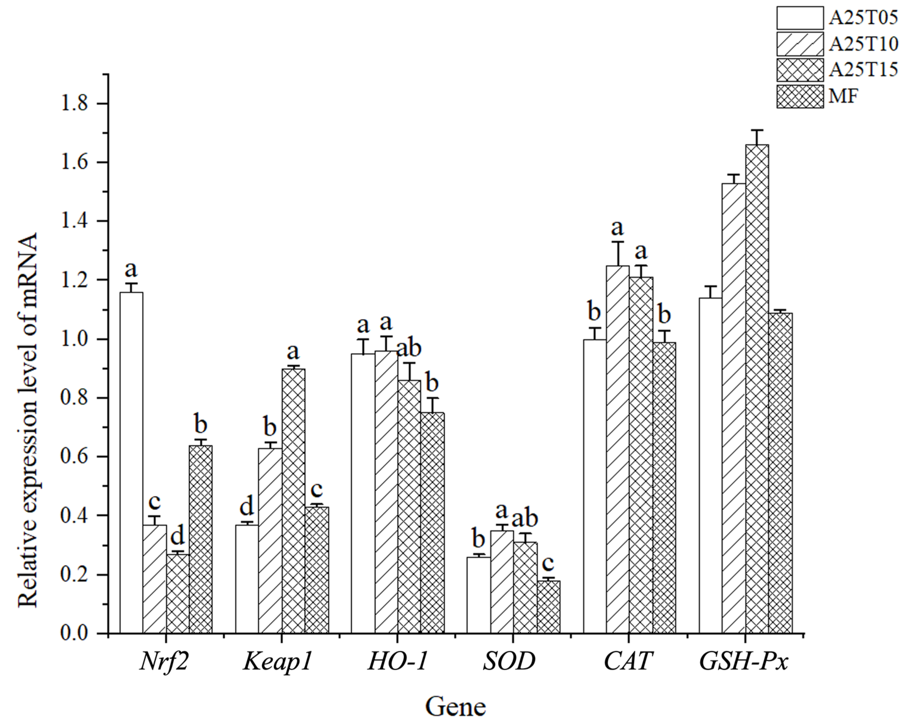 | CAT/(U/mg) | 5.85 ± 0.20 d | 20.34 ± 0.38 a | 15.6 ± 0.74 b | 11.45 ± 0.23 c |