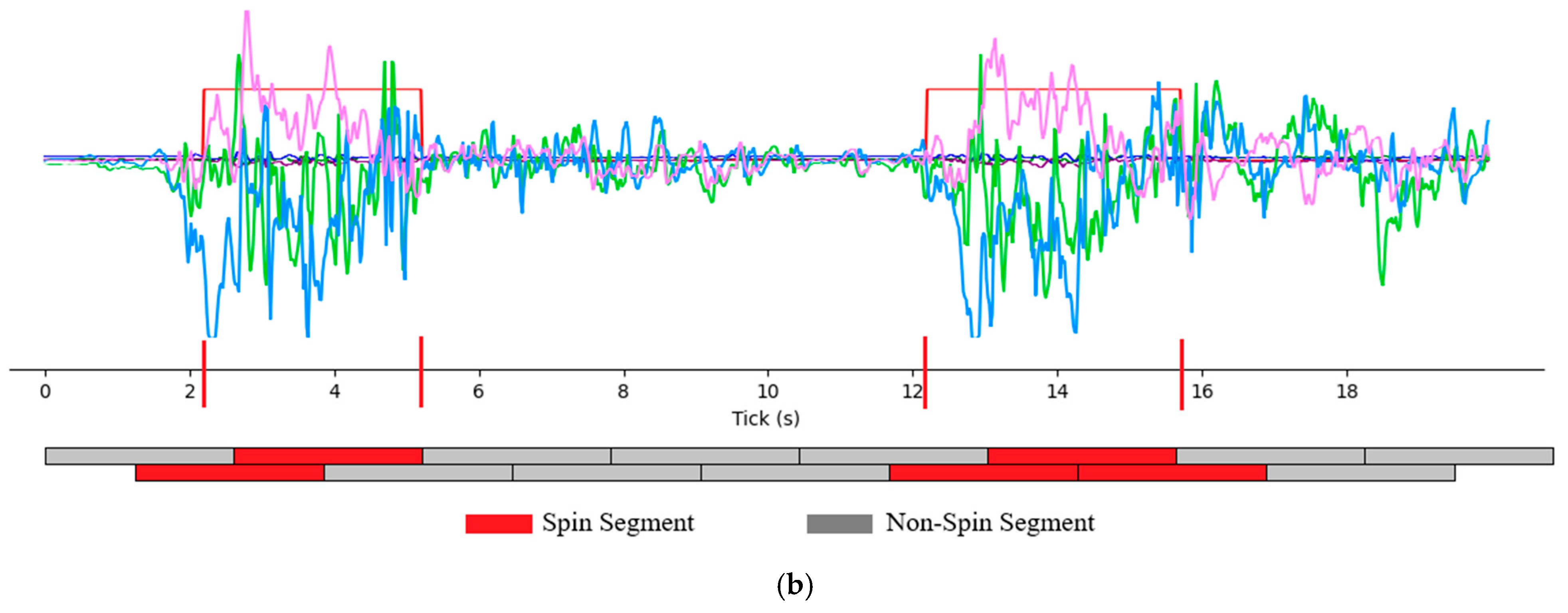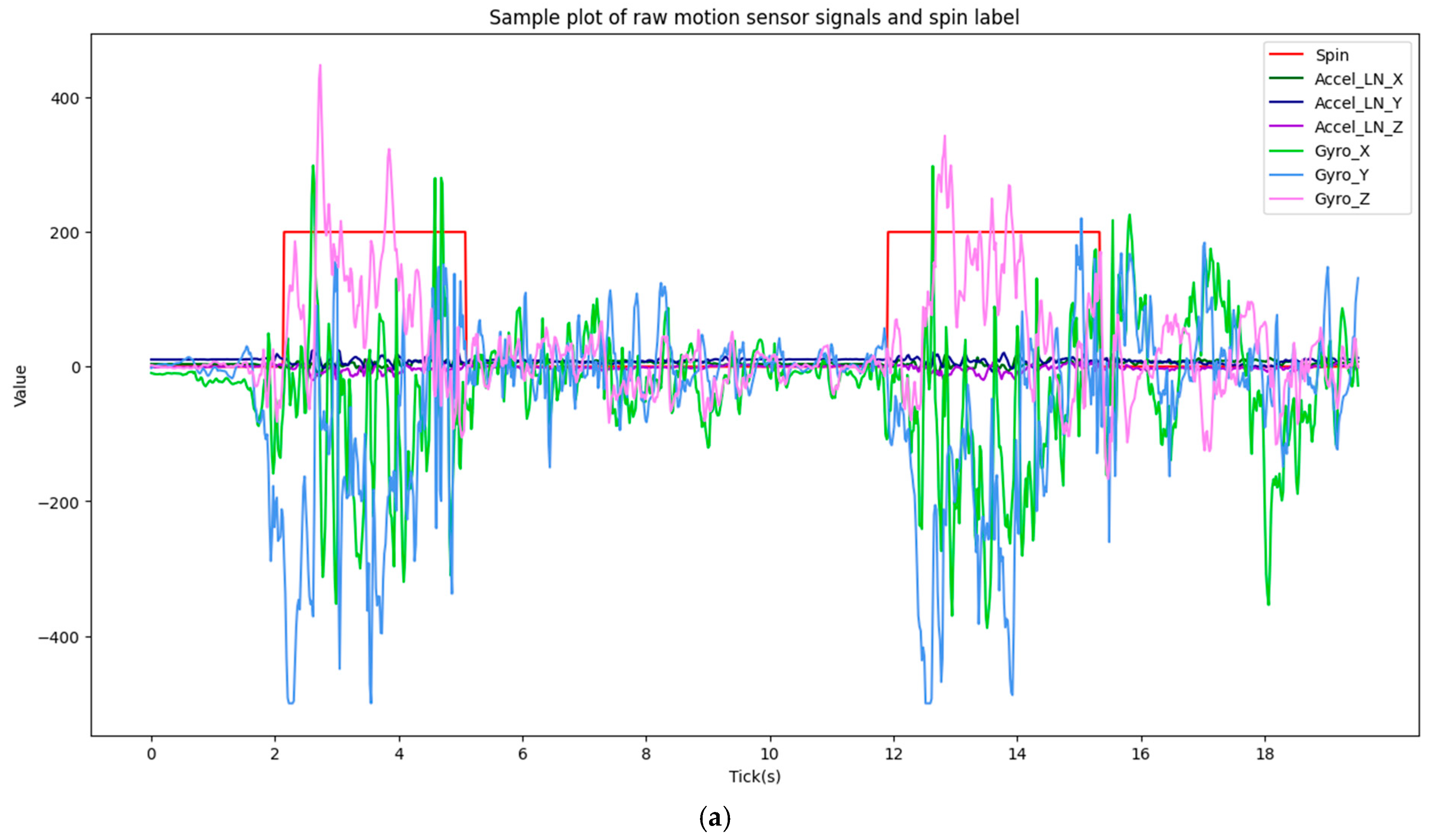 Figure 3). A 2.6 s window (window_size = 2.6 s), corresponding to 130 data points at 50 Hz, was selected to align with the mean (2.58 s) and median (2.52 s) event durations. A stride of 65 points (stride_size = 1.3 s) was used, creating a 50% overlap to augment the dataset. The label for each resulting segment was determined by its constituent points; if 50% or more of the data points within a window were part of a spin event, the entire segment was labelled as ‘spinning’, otherwise, it was considered ‘non-spinning’ (as in