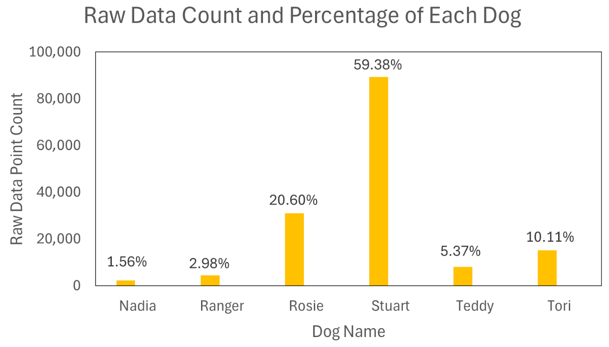 To establish ground truth for model training, a meticulous manual annotation process was undertaken by cross-referencing sensor data streams with the corresponding video recordings. The final annotated dataset comprised over 3000 s of time-series data, encompassing 135 distinct instances of the target spinning behaviour. These spin events accounted for a total of 349 s, with individual event durations ranging from 1.02 to 5.42 s. The data were collected from six canine subjects, exhibiting a notable imbalance in the distribution of events per subject: Stuart (n = 74), Rosie (n = 23), Teddy (n = 16), Ranger (n = 10), Tori (n = 9), and Nadia (n = 3).
