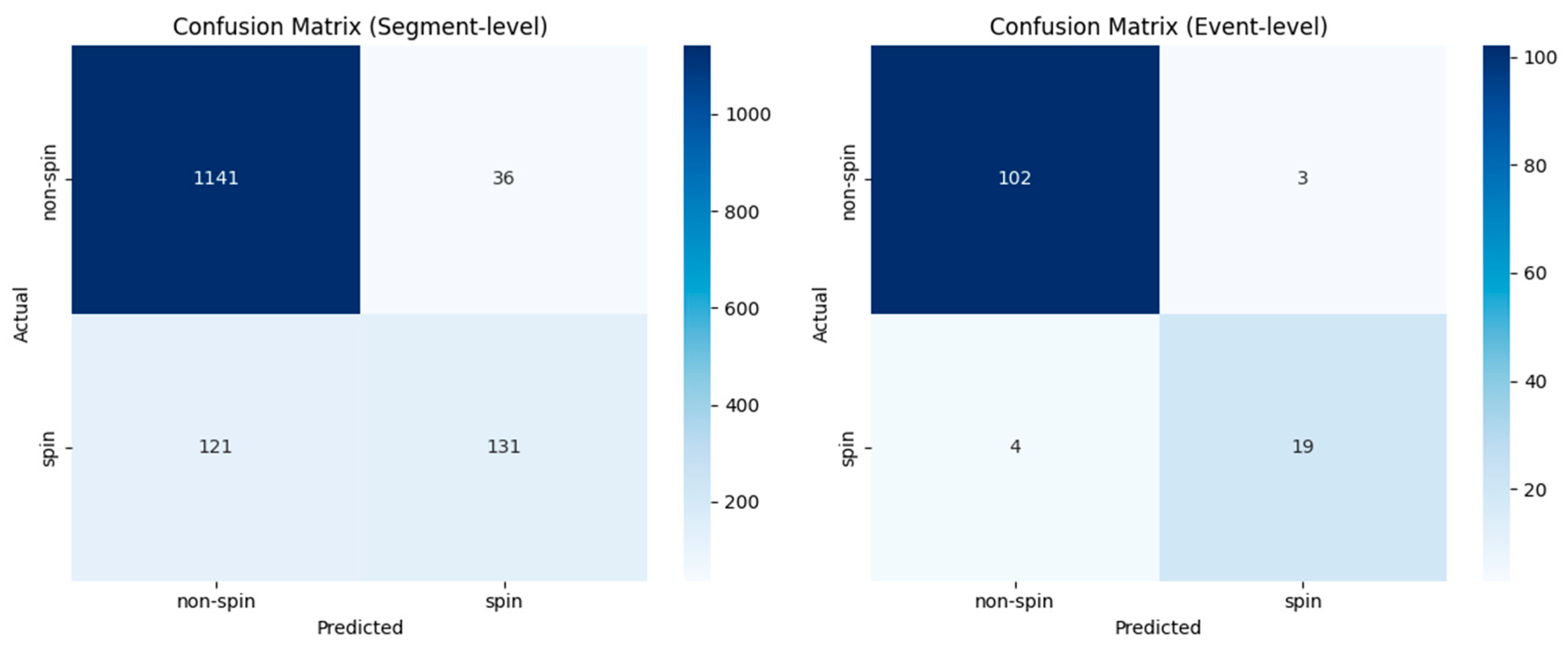 The model’s efficacy was assessed using a dual framework to measure both granular classification accuracy and practical detection capability. At the segment level, performance was quantified using standard metrics, including the F1-score, accuracy, and ROC-AUC. However, given that a single 2.6s window may only capture a fragment of a behaviour, a more practical event-level evaluation was conducted to account for the high cost of missed detections (false negatives). For this, a dedicated test set of curated 7.8 s events from the held-out subject was used. An event was classified as ‘spin’ if at least one of its five constituent 2.6 s segments received a positive prediction, with final performance judged by the trade-off between missed detections and false alarms.