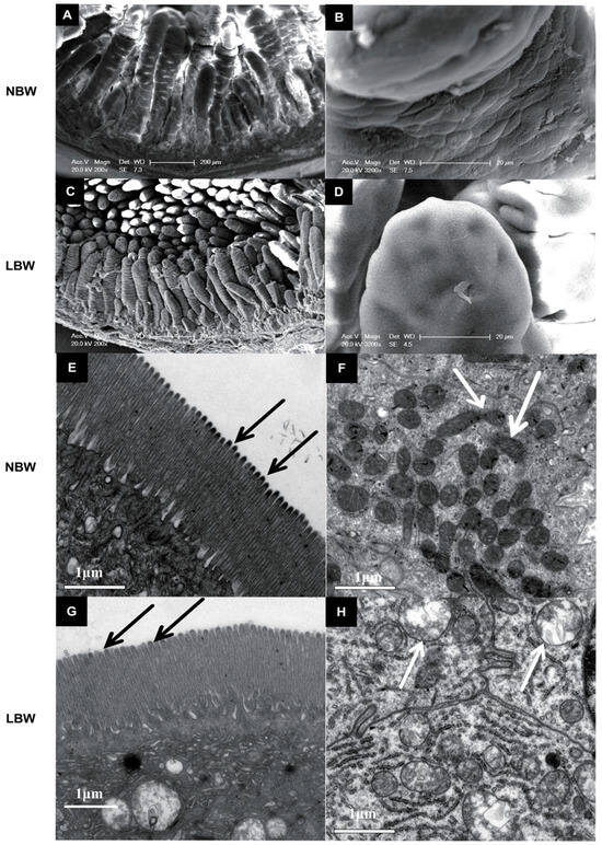 Effects of birth weight on the intestinal morphology and the interior structure of the intestine in Meishan pigs. (A,B,E,F) are pictures of the intestinal villi of normal-birth-weight (NBW) Meishan piglets, while the intestinal villus of low-birth-weight (LBW) piglets are shown in (C,D,G,H). The scale bar is 200 μm in (A) and (C), is 20 μm in (B) and (D) and is 1 μm in (E–H). Arrows indicate the mitochondria in panels (F) and (H).