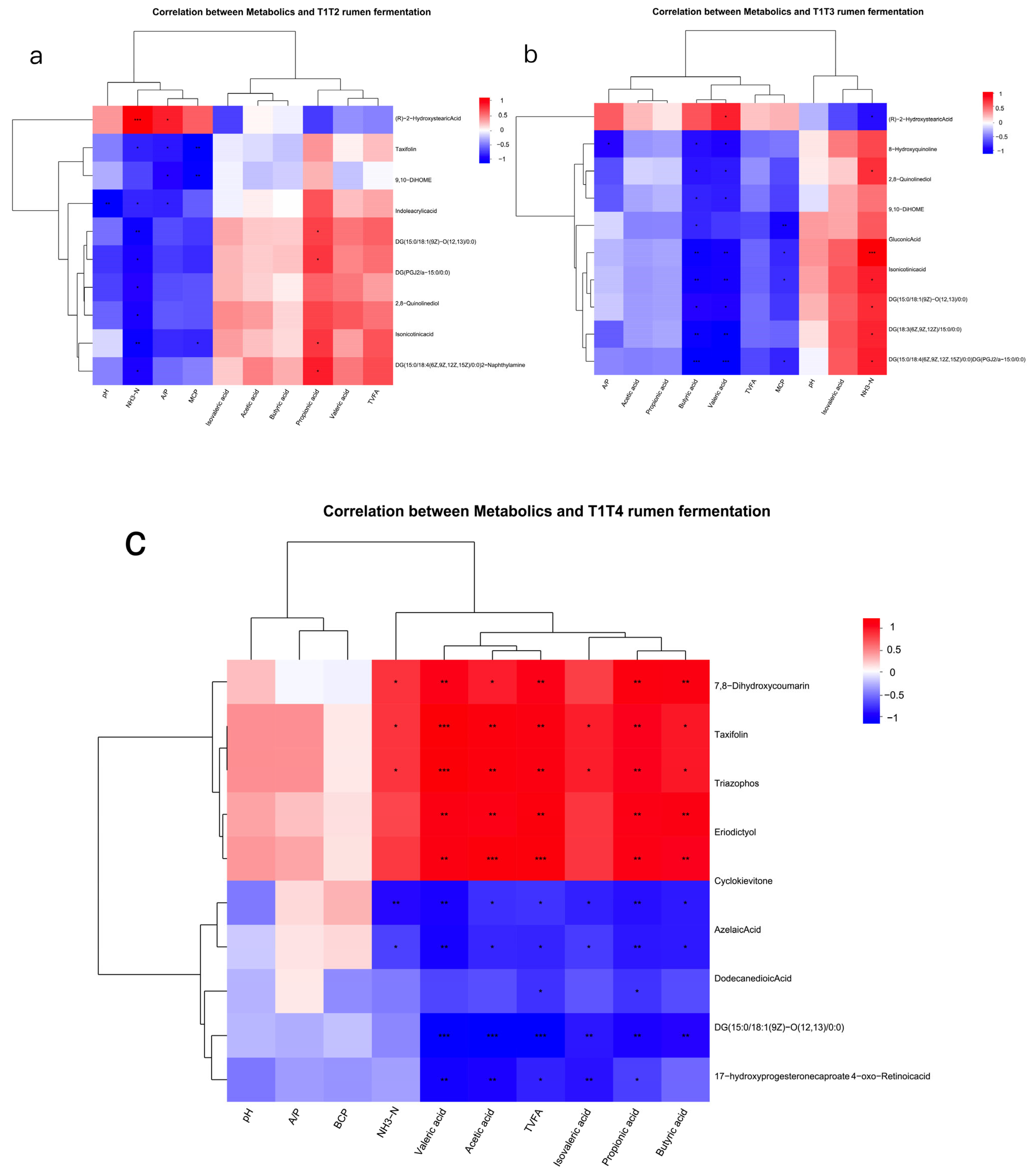 Sphaerochaeta and taxifolin showed a positive correlation, and taxifolin was also extremely significantly positively correlated with TVFA and VFA components.