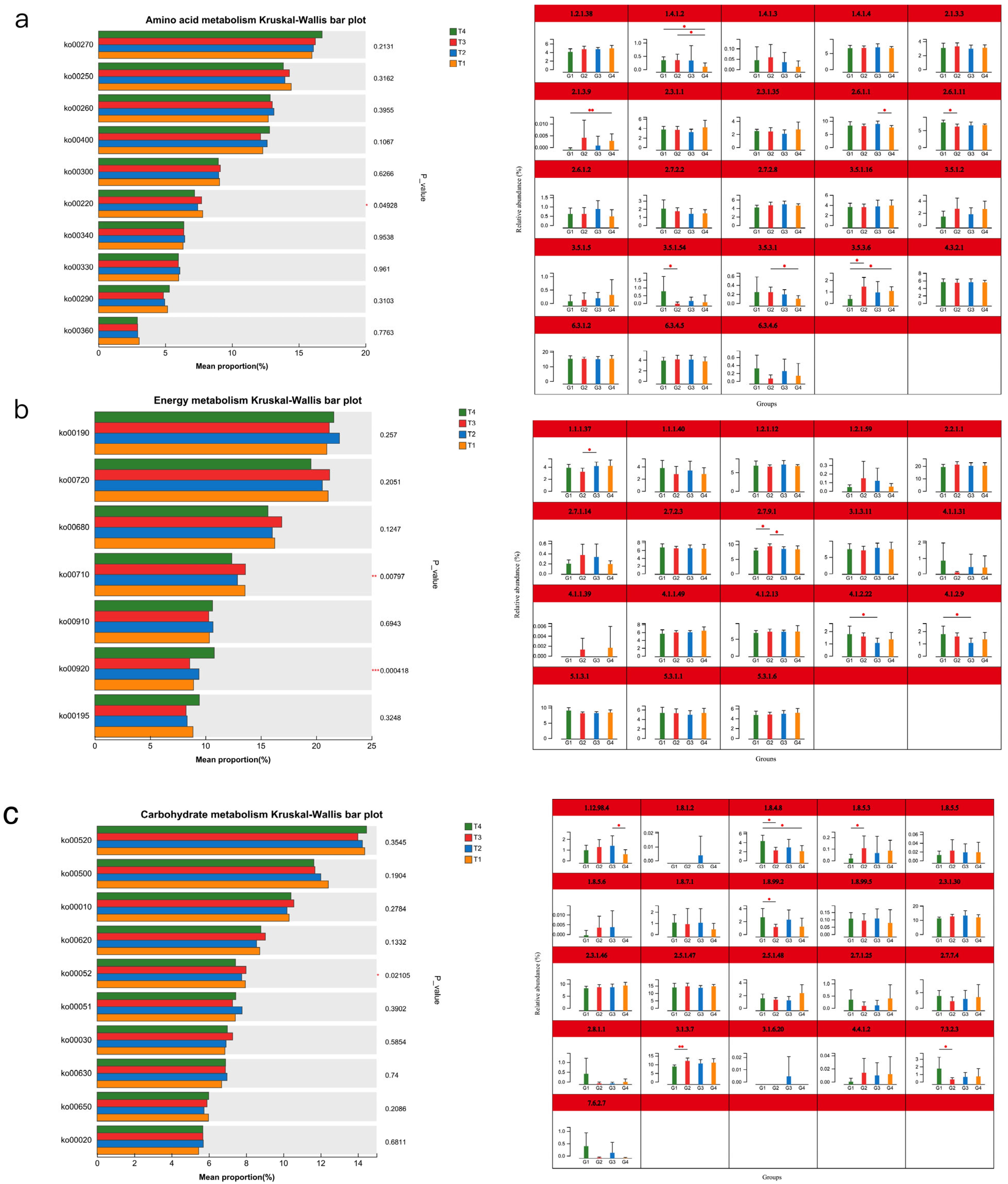 According to the KEGG function, we found that all groups had abundant “amino acid metabolism”, “carbohydrate metabolism” and “energy metabolism” functions regardless of diet. Interestingly, although all used urea, the results of its KEGG function enrichment at level 3 were different. The T2 group exhibited significantly abundant fructose and mannose metabolism ability, indicating that the rumen microorganisms in this group can effectively utilise the intermediate products of fibre degradation and avoid carbon waste [
