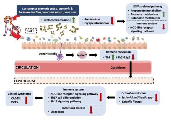 - Song, H.; Mun, S.H.; Han, D.W.; Kang, J.H.; An, J.U.; Hwang, C.Y.; Cho, S. Probiotics ameliorate atopic dermatitis by modulating the dysbiosis of the gut microbiota in dogs. BMC Microbiol. 2025, 25, 228. [Google Scholar] [CrossRef] [PubMed]