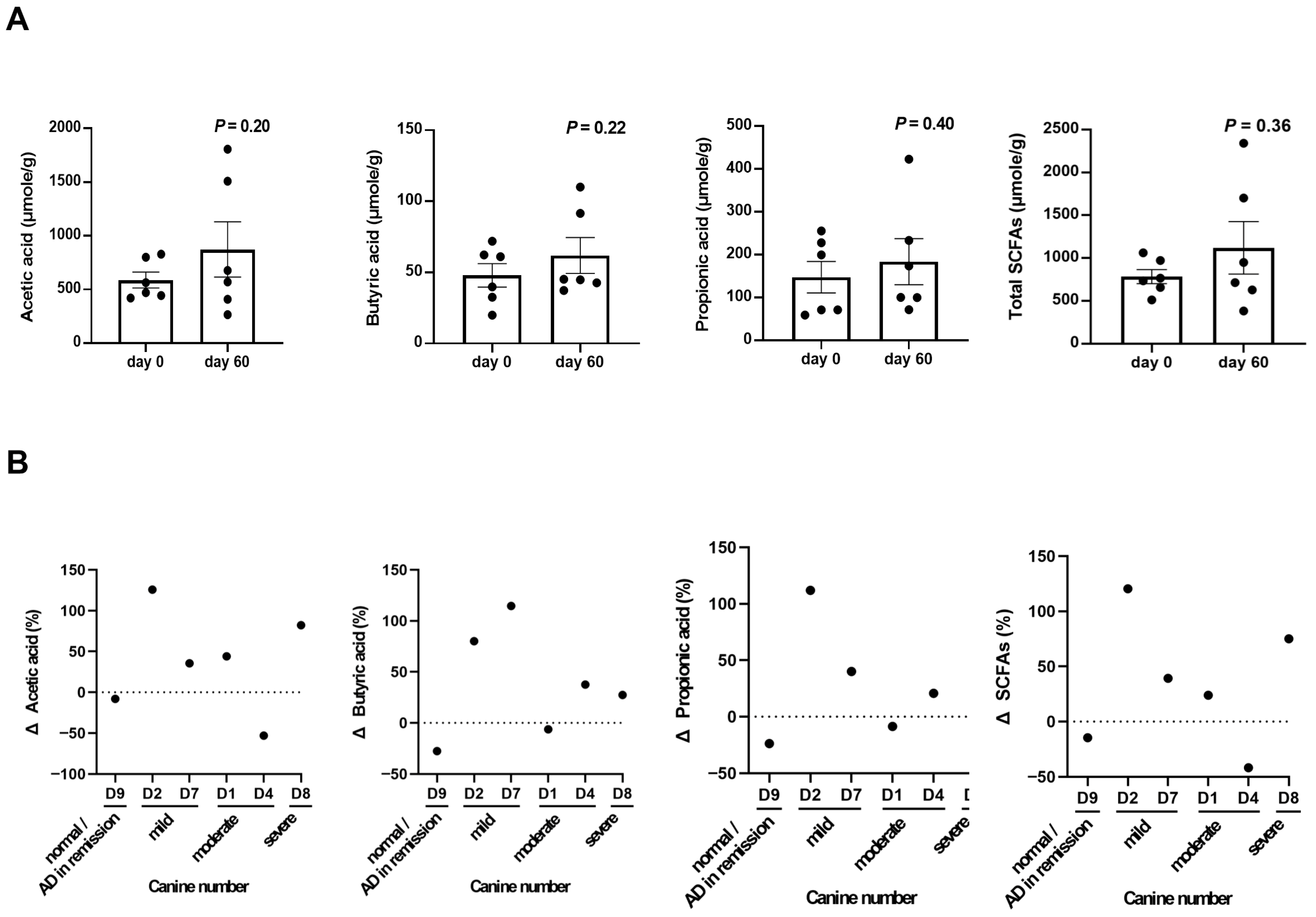 - Higueras, C.; Rey, A.I.; Escudero, R.; Díaz-Regañón, D.; Rodríguez-Franco, F.; García-Sancho, M.; Agulla, B.; Sainz, A. Short-chain and total fatty acid profile of faeces or plasma as predictors of food-responsive enteropathy in dogs: A preliminary study. Animals 2021, 12, 89. [Google Scholar] [CrossRef]