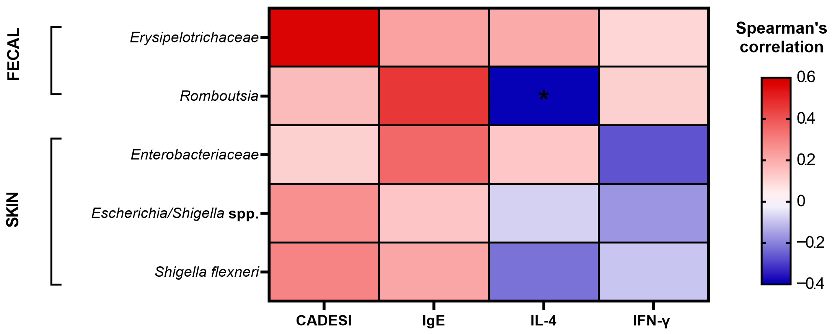 3.6. Correlation Analysis Between Fecal and Skin Microbiota and Atopic Dermatitis Indicators