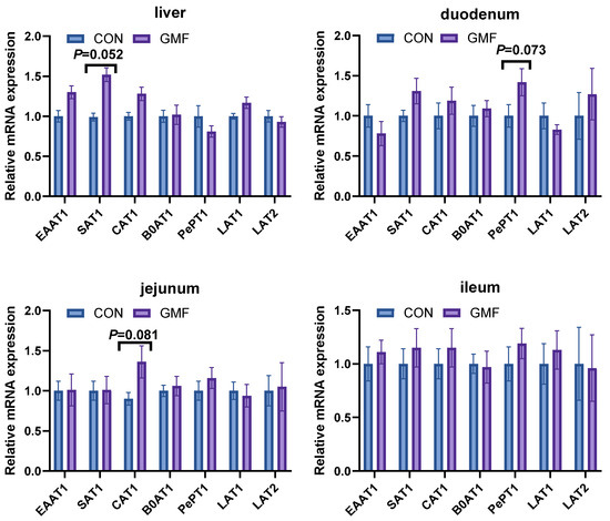 According to the data in Table 5, compared with the CON group, the GMF group significantly altered serum amino acid profiles, increasing essential amino acids, Thr, Glu, Ala, Val, Cys, Ile, Lys, and total amino acids levels (p < 0.05), while decreasing Tau and Tyr (p < 0.05), Leu, Asp, and Pro levels (0.05 < p < 0.1). To further investigate the underlying mechanisms, gene expression analysis was performed. As illustrated in Figure 1, gene expression analysis indicated upward trends in mRNA expression of hepatic SAT1, duodenal PePT1, and jejunum CAT1 (0.05 < p < 0.1).
