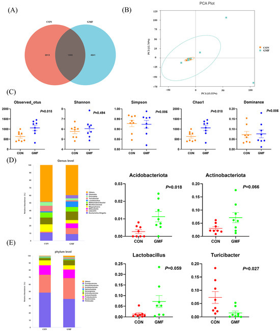 Between the CON and GMF groups, gut microbiota profiling (Figure 2A) identified 1090 shared operational taxonomic units (OTUs), with 2013 and 4841 unique OTUs, respectively. Principal Coordinate Analysis (PCA, Figure 2B) showed that the β-diversity of the CON group overlapped with that of the GMF group. Alpha diversity indices (Chao1 and observed features) were significantly greater than CON group (p < 0.05, Figure 2C). At the phylum level (Figure 2D), GMF group elevated the relative abundance of Acidobacteriota (p < 0.05) and showed trends toward greater Actinobacterota (0.05 < p < 0.1). Genus-level analysis (Figure 2E) showed reduced Turicibacter (p < 0.05) and trends toward elevated the relative abundance of Lactobacillus and Olsenella (0.05 < p < 0.1).
