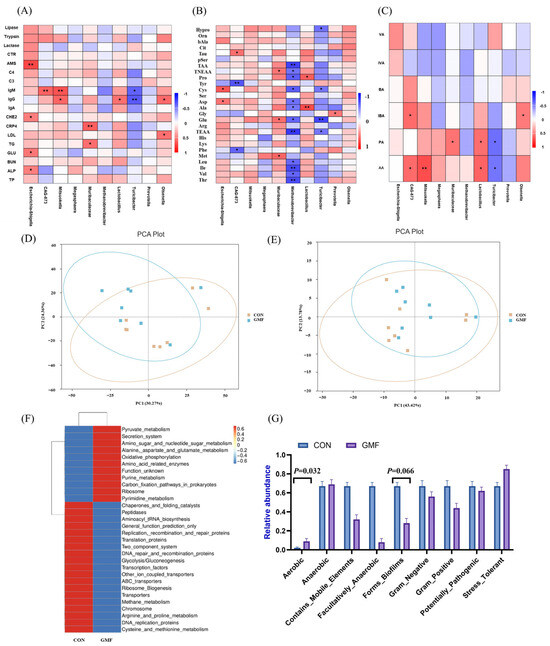 G Heatmap of Spearman’s correlations analysis and analysis of metabolic functions and phenotypes of colonic microbiota. Correlation analysis between colonic microbiota (A) serum biochemical indices, immune markers, and digestive enzyme activity; (B) circulating free amino acids; (C) short-chain fatty acid profiles at the genus level; (D,E) The PCA based on EC and pathways of PICRUSt2; (F) Clustering analysis of the relative abundance of functional pathways based on KEGG (Kyoto Encyclopedia of Genes and Genomes) annotation predicted by PICRUSt2; (G) Metabolic phenotype analysis using BugBase. TAA, Total amino acids; TNEAA, Total non-essential amino acids; TEAA, Total essential amino acids; AA, Acetic acid; PA, Propionic acid; IBA, Isobutyric acid; BA, Butyric acid; IVA, Isovaleric acid; VA, Valeric acid.; CON, control group, standard formula milk powder; GMF, goat milk formula powder, * p < 0.05 and ** p < 0.01. Results are all expressed as means ± SEM (n = 8), and p ≤ 0.05 was considered to be a significant difference.