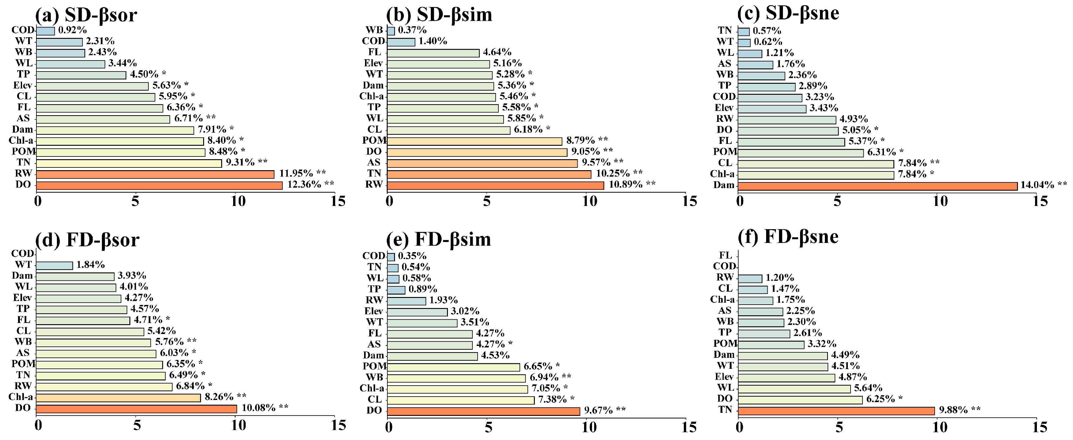 - Menezes, R.F.; Svenning, J.-C.; Fu, H.; De Meester, L.; Lauridsen, T.L.; Søndergaard, M.; Conde-Porcuna, J.M.; Jeppesen, E. Fish Beta Diversity Patterns across Environmental Gradients in 63 European Shallow Lakes: Effects of Turbidity, Nutrient Enrichment, and Exotic Species. Water 2023, 15, 1831. [Google Scholar] [CrossRef]