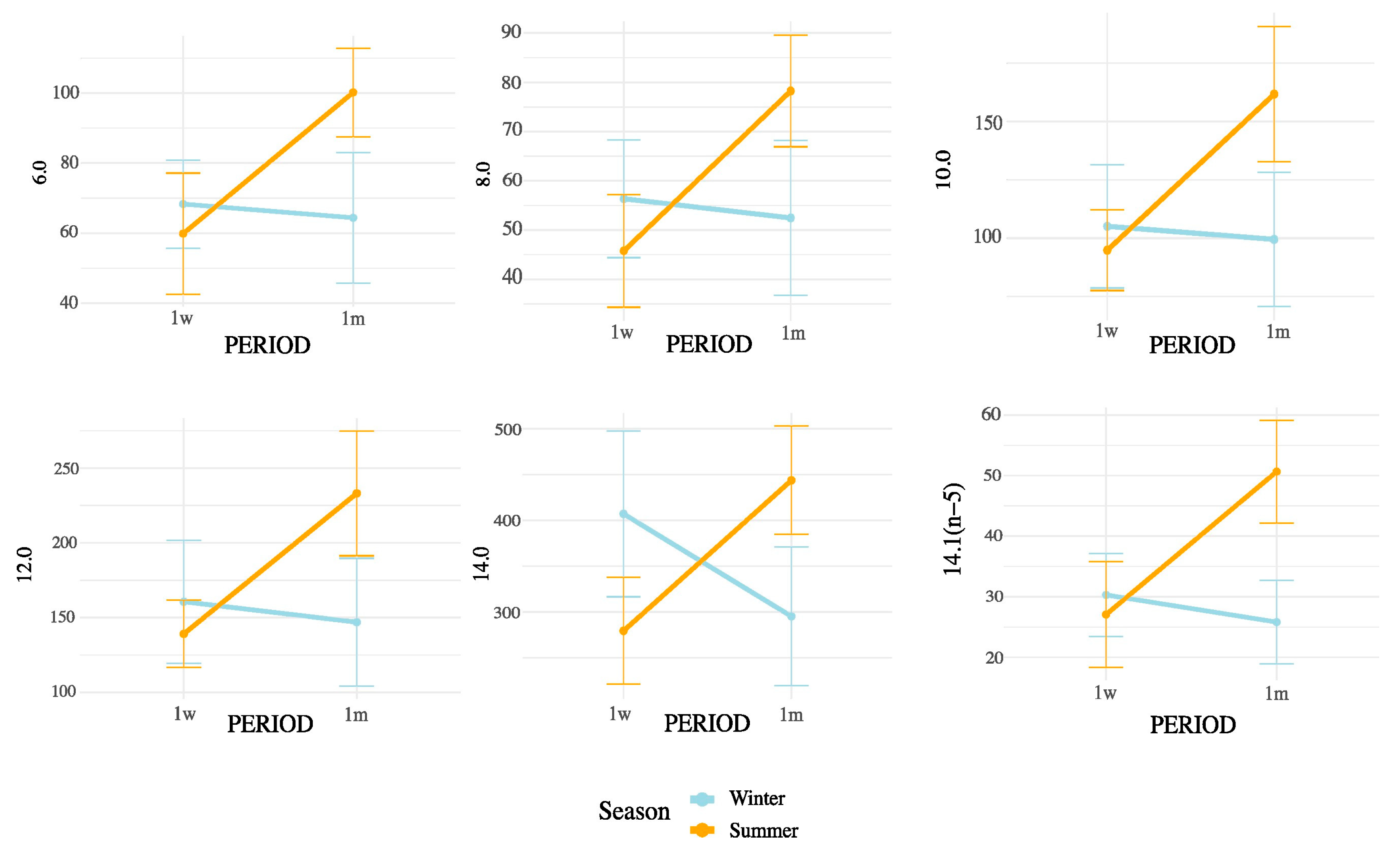 Notably, all SMCFA (C6:0, C8:0, C10:0, C12:0, C14:0, and C14:1(n-5)) showed highly significant interaction effects (p < 0.01), suggesting that their concentrations were influenced not only by postpartum stage or season independently, but by their combination. Among LCFAs, strong interaction effects were observed for C15:0, C16:0, C16:1(n-9), C16:1(n-7), C16:1(n-13)t, C17:0, C18:0, and C20:0 (all p < 0.05). In contrast, some unsaturated LCFAs such as cis-9 C18:1, cis-11 C18:1, and cis-13 C18:1 showed no significant interaction. Importantly, the interaction term was also significant for broader lipidic indicators, including total fatty acids (p = 0.0004), SFA (p = 0.0001), MUFA (p = 0.0147), PUFA (p = 0.0021), omega-3 (p = 0.0005), omega-6 (p = 0.0024), and CLAs (p = 0.0104). These results underscore that both the metabolic adaptations during early lactation and the exposure to summer heat stress may synergistically affect the lipid composition of milk. These interactions are represented in Figure 3 (SMCFA) and Figure 4 (LCFA).