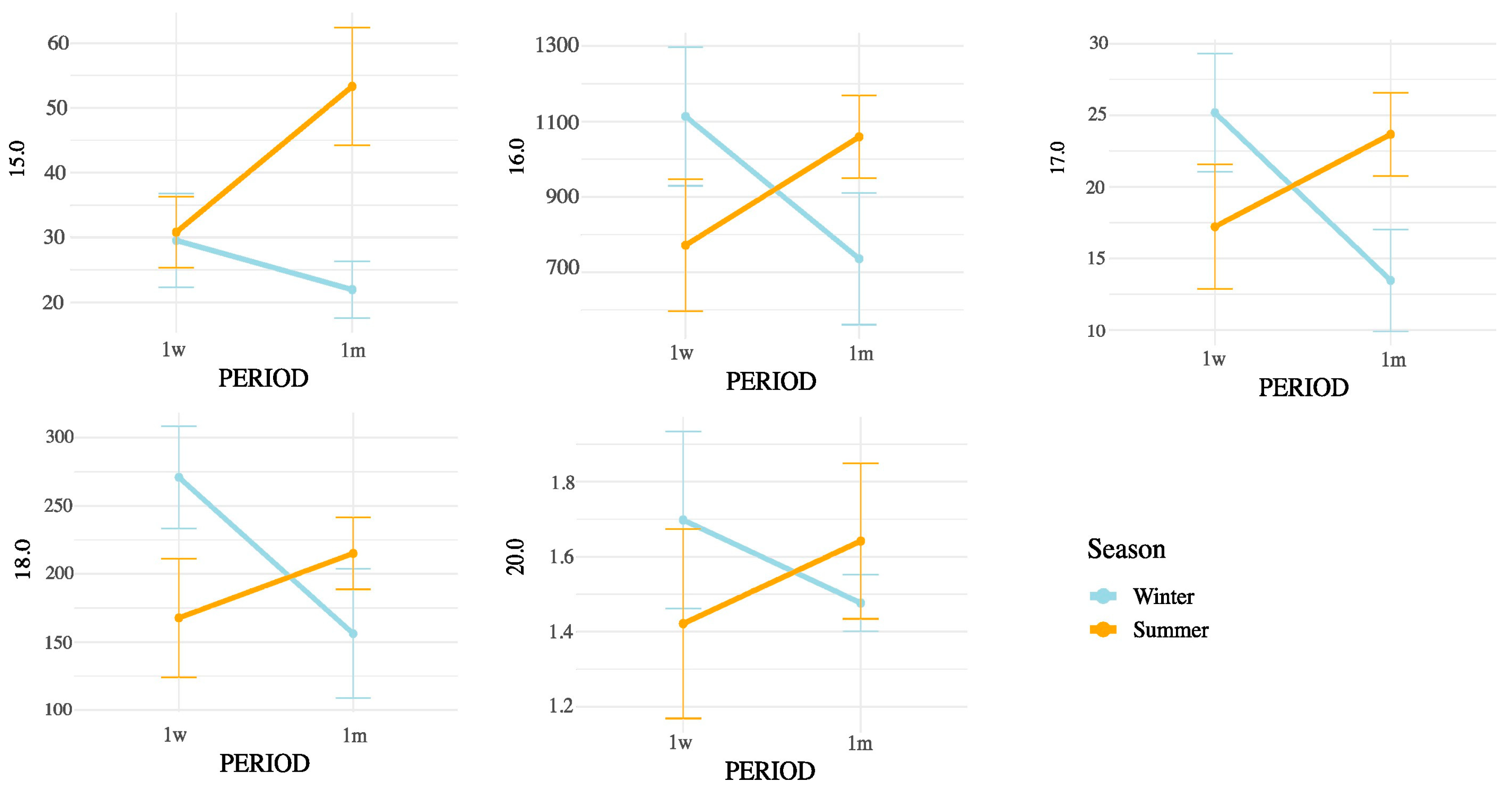 W1w: Winter—1 week postpartum; W1m: Winter—1 month postpartum; S1w: Summer—1 week postpartum; S1m: Summer—1 month postpartum; * p < 0.05; values in bold superscript denote significant differences.