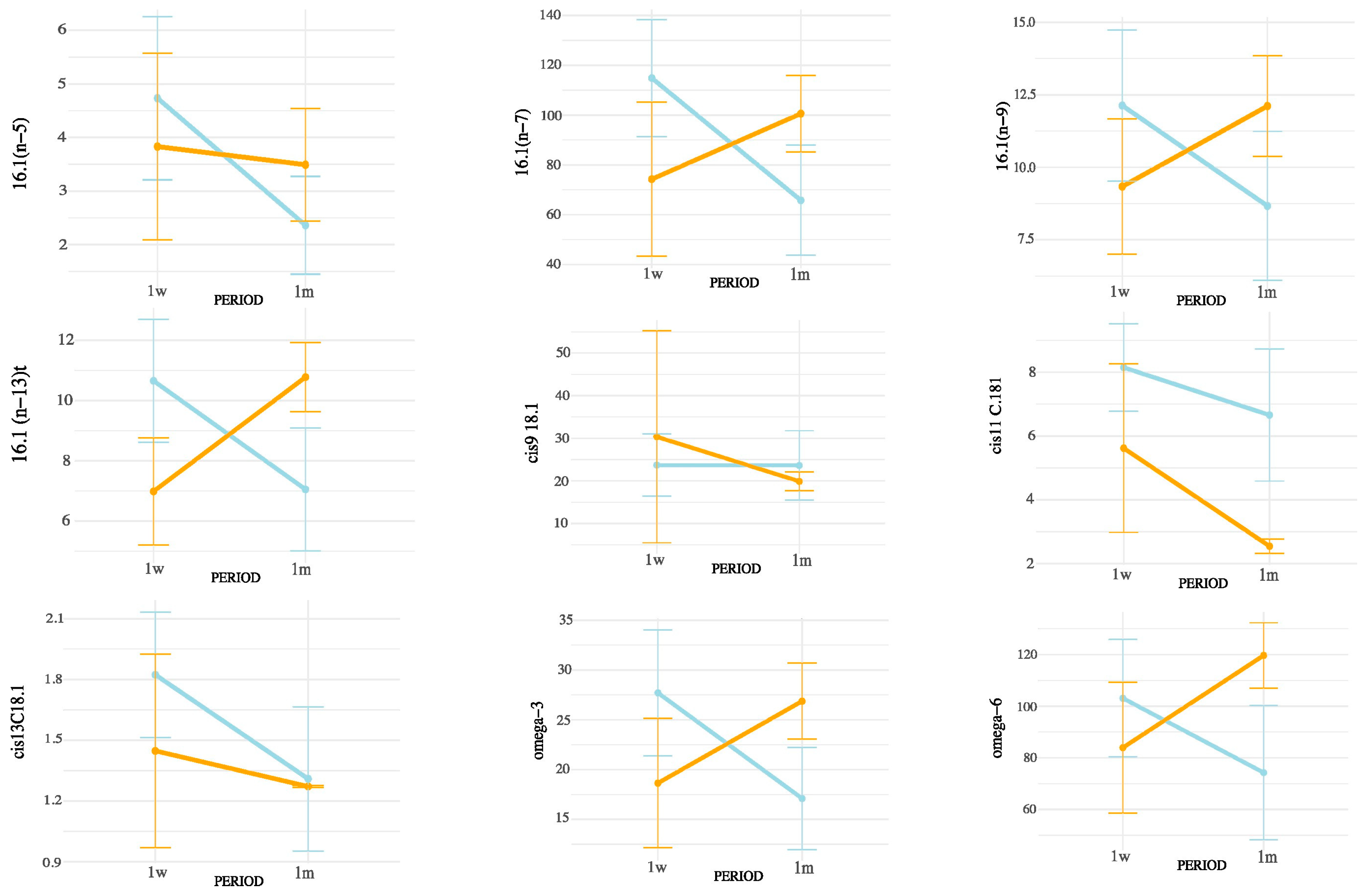Figure 4, Figure 5 and Figure 6 display the mean concentrations (±95% confidence interval) of individual LCFAs (C15:0, C16:0, C18:0, cis-9-C18:1, cis-11-C18:1, cis-13-C18:1, C20:0, omega-3, and omega-6) and total lipid fractions (SFA, MUFA, PUFA, and total fat) in bovine milk, stratified by postpartum stage on the x axis (1 week vs. 1 month) and season (winter vs. summer). Notable interaction effects highlight how dietary intake, ruminal biohydrogenation, and adipose mobilization may vary in response to environmental and physiological factors.