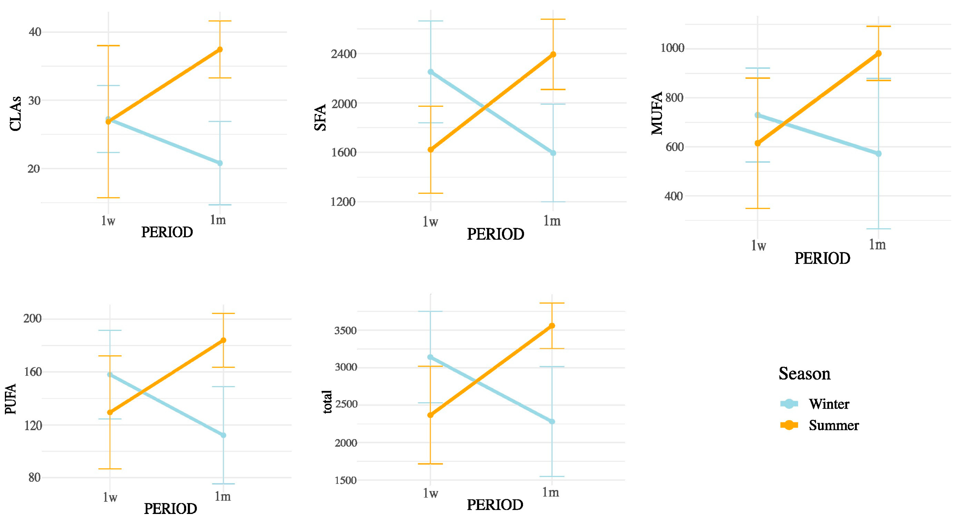 Table 3 presents the results of the two-way ANOVA examining the effects of postpartum period (1 week vs. 1 month) and table between seasons (winter vs. summer) on total FA content.
