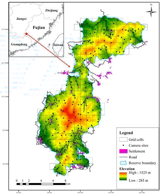We divided the whole reserve into a grid of 1 × 1 km cells by using the fishing net tool in ArcGIS 10.2, making use of the distribution and availability of dirt roads inside grids. We positioned one unbaited camera trap (ERE-E3H-C, Shenzhen Ereagle Technology Co., Ltd., Shenzhen, China) along roads and wildlife trails within each grid from September 2022 to October 2023. In total, 181 camera traps were installed, and adjacent camera sites were at least 300 m apart in the reserve (Figure 1), and all cameras were operational simultaneously, allowing continuous data collection across the study period. The cameras were fastened to trees or bushes 0.3–0.6 m above the ground and programmed to capture three consecutive photographs followed by a 15 s video for each triggering event, with a trigger interval of 0 s between consecutive events, using medium sensitivity settings for optimal results []. In order to avoid false triggering, the vegetation around each camera trap was cleared wherever necessary. The camera traps were set to operate for 24 h a day throughout the year. Environmental information of each camera site was recorded, such as installation time, GPS location, elevation, and forest types. We visited each camera trap every three months to check the operating state and replace the memory cards and batteries. Camera traps in each grid cell were also replaced if broken or lost.