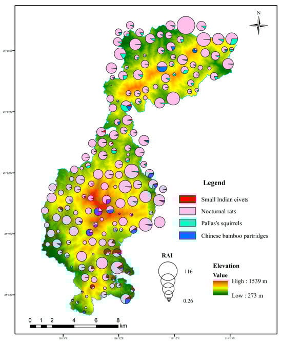 During the study periods, a total of 43,888 independent photos of mammal and bird species were taken from 60,901 trap days across 180 camera traps, including 307 detections of small Indian civets, 10,429 detections of nocturnal rats, 518 detections of Chinese bamboo partridges, and 629 detections of Pallas’s squirrels (Table 1). Nocturnal rats were widely distributed and detected at 179 sites in the study area, followed by Pallas’s squirrels and Chinese bamboo partridges. The RAI of nocturnal rats was the highest, followed by Pallas’s squirrels, but that of small Indian civets was the lowest. Small Indian civets were mainly recorded in the central and southern parts of our study area (Figure 2).