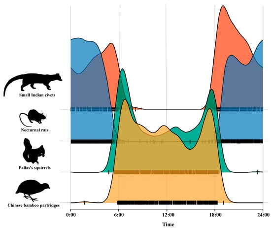 Kernel density overlap indices indicated that the temporal overlap between small Indian civets and nocturnal rats was the highest (Δ = 0.72), followed by Pallas’s squirrels (Δ = 0.20), with Chinese bamboo partridges (Δ = 0.16) being the lowest pair values.