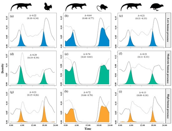 The temporal overlap between small Indian civets (solid curves) and their potential prey (dashed curves) in areas of low (a–c), moderate (d–f) and high (g–i) levels of human presence in Liangyeshan National Nature Reserve. Shaded area denotes the overlapping time under the two density curves (Δ).