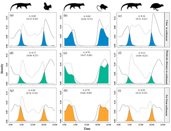 The temporal overlap between small Indian civets (solid curves) and their potential prey (dashed curves) in areas of close (a–c), moderate (d–f) and far (g–i) distance to settlement in Liangyeshan National Nature Reserve. Shaded area denotes the overlapping time under the two density curves (Δ).