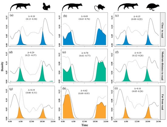The temporal overlap between small Indian civets (solid curves) and their potential prey (dashed curves) in areas of close (a–c), moderate (d–f) and far (g–i) distance to road in Liangyeshan National Nature Reserve. Shaded area denotes the overlapping time under the two density curves (Δ).