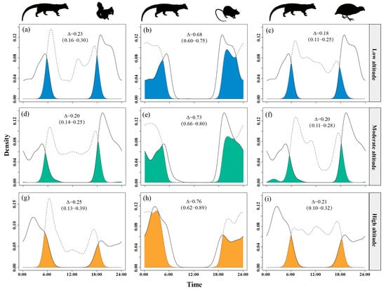 The temporal overlap between small Indian civets (solid curves) and their potential prey (dashed curves) in areas of low (a–c), moderate (d–f) and high (g–i) altitude in Liangyeshan National Nature Reserve. Shaded area denotes the overlapping time under the two density curves (Δ).