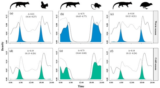 The temporal overlap between small Indian civets (solid curves) and their potential prey (dashed curves) in the warm (a–c) and cold (d–f) seasons in Liangyeshan National Nature Reserve. Shaded area denotes the overlapping time under the two density curves (Δ).