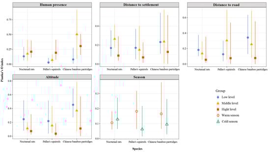 Spatial overlap (Pianka’s index and 95% confidence intervals) between small Indian civets and their potential prey under different human disturbances and different altitudes and seasons in Liangyeshan National Nature Reserve. Pianka’s index ranges from 0 (no overlap) to 1 (complete overlap).
