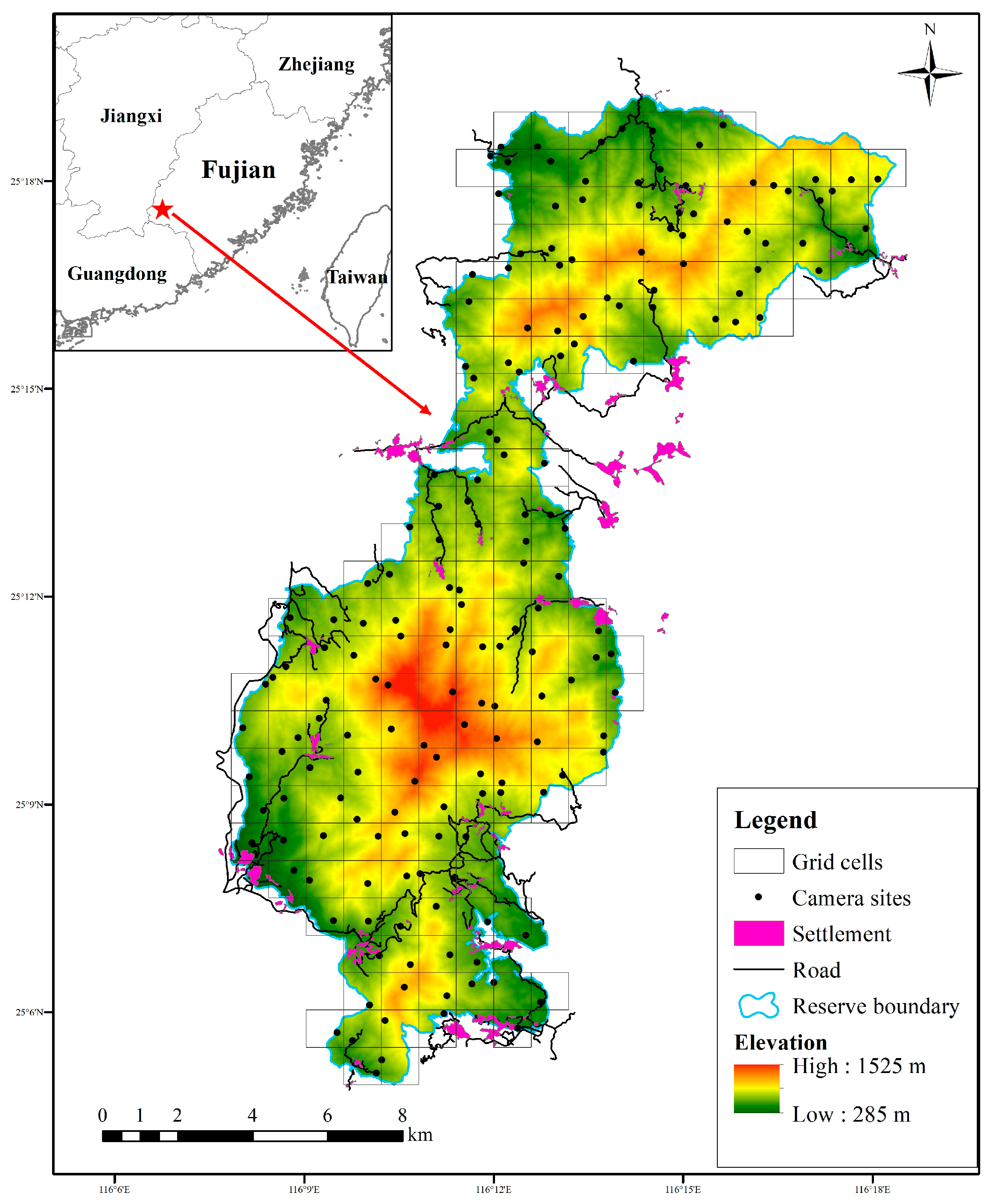 - Ji, C.P.; Li, H.D.; Xiao, W.H.; Xu, K.; Ren, Y.F.; Li, H.Y.; Wang, P.C.; Fan, M.L.; Huang, X.Q.; Xiao, Z.S. Fine-Scale Interactions between Leopard Cats and Their Potential Prey with Contrasting Diel Activities in a Livestock-Dominated Nature Reserve. Animals 2023, 13, 1296. [Google Scholar] [CrossRef]