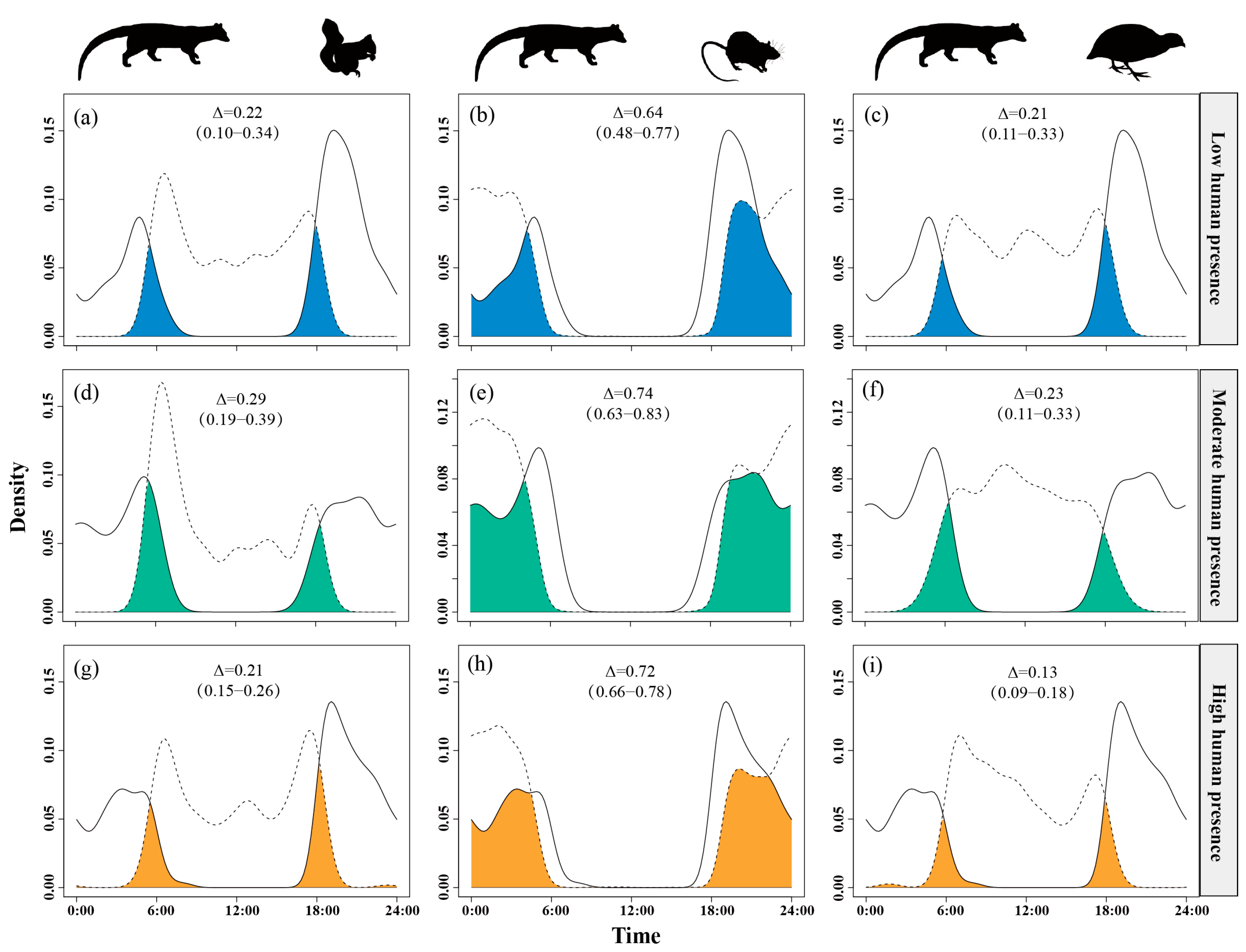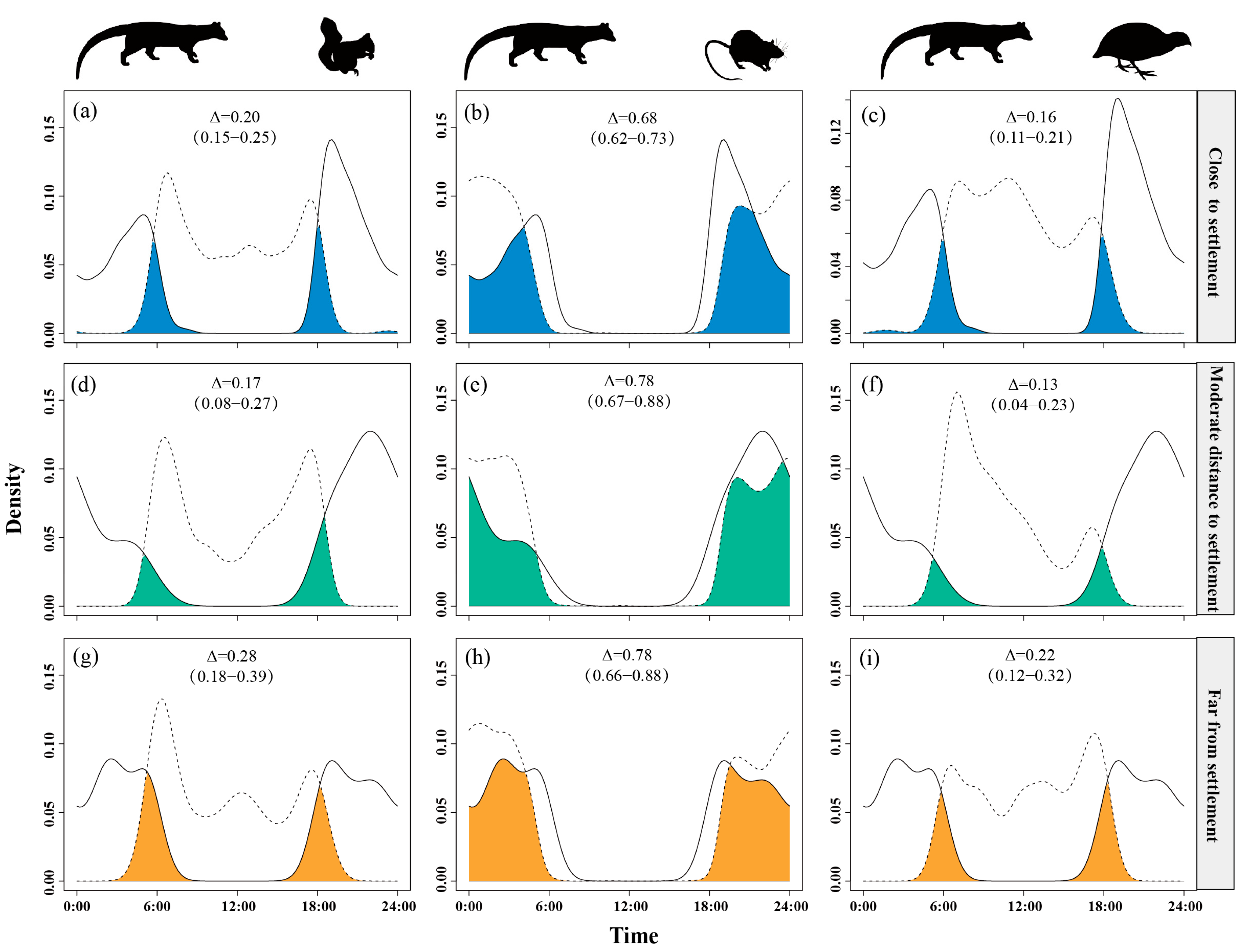 Ji, C.; Huang, X.; Lin, Y.; Cheng, Y.; Le, T.; Tan, F. The Human Shield in Time but Not in Space: Scale-Dependent Responses of Small Indian Civet–Prey Interactions to Anthropogenic Disturbance. Animals 2025, 15, 3121. https://doi.org/10.3390/ani15213121