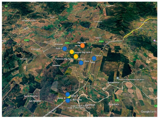 These plantations contribute to the landscape’s composition but also pose environmental challenges, such as reducing biodiversity and altering hydrological cycles. The heavily modified vegetation reflects the dual pressures of agricultural expansion and forestry operations, coupled with socio-environmental conflicts from intensive pig farming and agrochemical usage [45]. The sampling design involved capturing houseflies (M. domestica) using adhesive traps deployed in five distinct geographic zones, as identified in Figure 1. These zones were strategically chosen based on their varying distances from the pig farm and two pig farm forestry. The traps were installed in 5 homes across these zones and remained in place for one week to ensure adequate collection of samples. The pollution generated by this facility has significantly impacted air and water quality, affecting the health of the local population and the natural and economic environment [45].