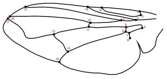 Graphical representation of the wing of Musca domestica with 19 landmarks.