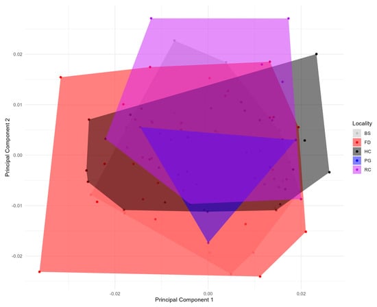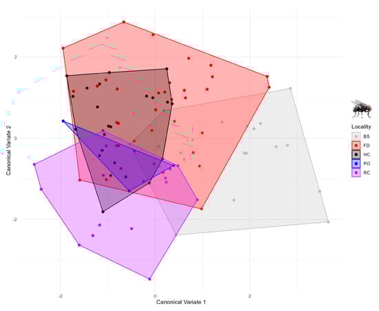 The canonical variate analysis (CVA) enhanced the shape differences among localities and revealed distinct clustering patterns (Figure 5). Individuals from FD exhibited considerable shape variability, overlapping with all other groups, which indicates a high degree of variance within the population. In contrast, flies from BS and RC exhibited more divergent wing shapes, forming clusters that did not overlap with those of the remaining groups, suggesting localized morphological differentiation. Conversely, PG and HC populations displayed strongly overlapping morphospaces, reflecting more similar wing shape configurations across these sites. Overall, the CVA results highlight both shared variation and unique morphotypes among localities, suggesting that exposure intensity and local environmental factors jointly shape patterns of wing morphology.