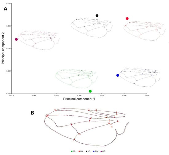 (A) Principal component analysis (PCA) of the average wing shape of Musca domestica across localities in the Arbolillo region. Each color represents a different locality where traps were placed. (B) Wing outlines depict the superimposed average wing shapes for each locality, corresponding to their respective colors.