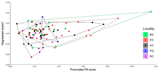 The multivariate regression of the shape vs. Procrustes FA scores (Figure 6), showed the values of asymmetry were more likely to be from the organism of FD and HD which have more individuals with higher levels of wing shape Fluctuating asymmetry, on the other hand a clear shape variation was found for RC and PG populations, where for the latter a not clear intensity of FA was found, which was not same as found in the Procrustes ANOVA. Finally, a unique organism after (revised any outlier proportion in their asymmetry) was found to have higher levels of FA Scores from BS.