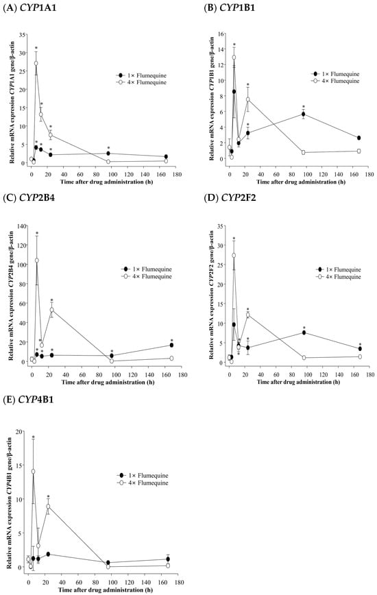 CYP2B4 expression was significantly increased in both treatment groups. In the 1× flumequine group, moderate increases were observed at all time points, ranging from 2.3 to 7.5-fold (p < 0.05). In contrast, the 4× group showed a 46.6-fold increase at 6 h, with sustained upregulation of 7.4 and 23.8-fold at 12 and 24 h, respectively (Figure 1C) (p < 0.05). In the case of CYP2F2, 1× flumequine significantly induced gene expression by 6.4-fold compared with that in the control group at 96 h (Figure 1D) (p < 0.05). Furthermore, 4× flumequine resulted in a 23.0-fold significant increase at 6 h, which was 3.6-fold higher than the peak expression observed with 1× (Figure 1D) (p < 0.05). No significant increase in CYP4B1 gene expression was observed in the 1× flumequine compared to that in the control. However, 4× flumequine significantly upregulated CYP4B1 expression by 12.7-fold and 8.1-fold at 6 h and 24 h after administration, respectively (Figure 1E) (p < 0.05).