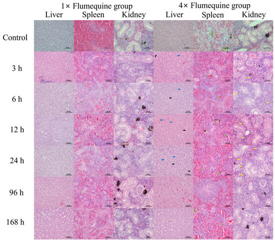 In the control group, no histopathological changes were observed in the liver, spleen, and kidney. However, mild hepatic atrophy, lymphocytic infiltration in the spleen, and hematopoiesis in the kidney were observed at 3 to 168 h in the test group exposed to 1× flumequine (Figure 2). In the 4× test group, hepatic atrophy (black arrows) and congestion (blue arrows) were observed from 3 to 24 h, along with lymphocytic infiltration (green arrows) in the spleen and hematopoiesis (yellow arrows) in the kidneys (Figure 2). All lesions observed in the 4× flumequine group exhibited a progressive increase in severity over time.