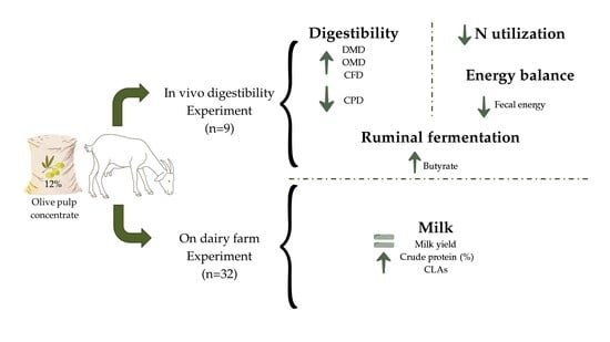 Inclusion of Novel Olive Pulp: Impacts on Nutrient Digestibility, Rumen Fermentation, and Dairy Goat Performance