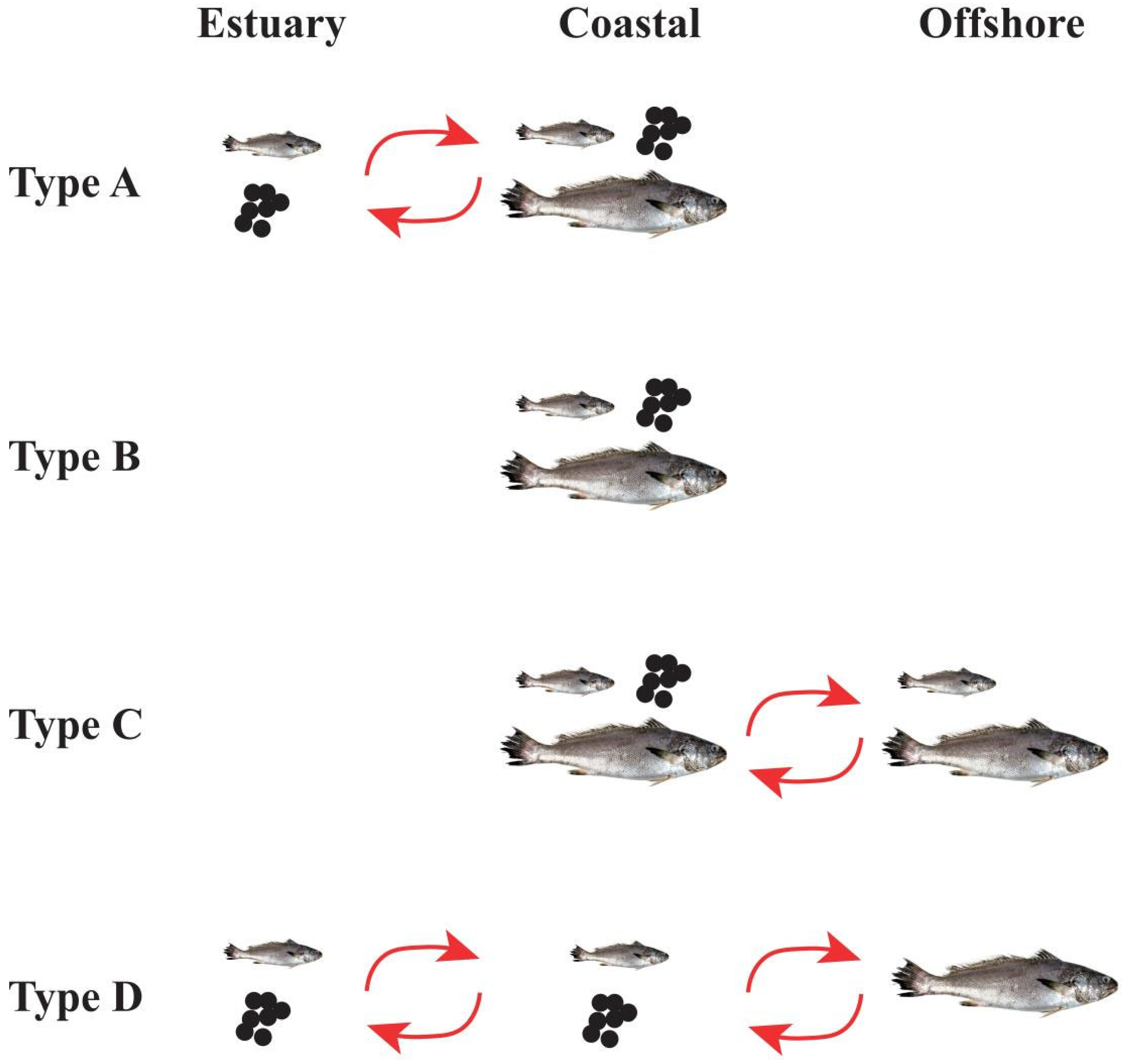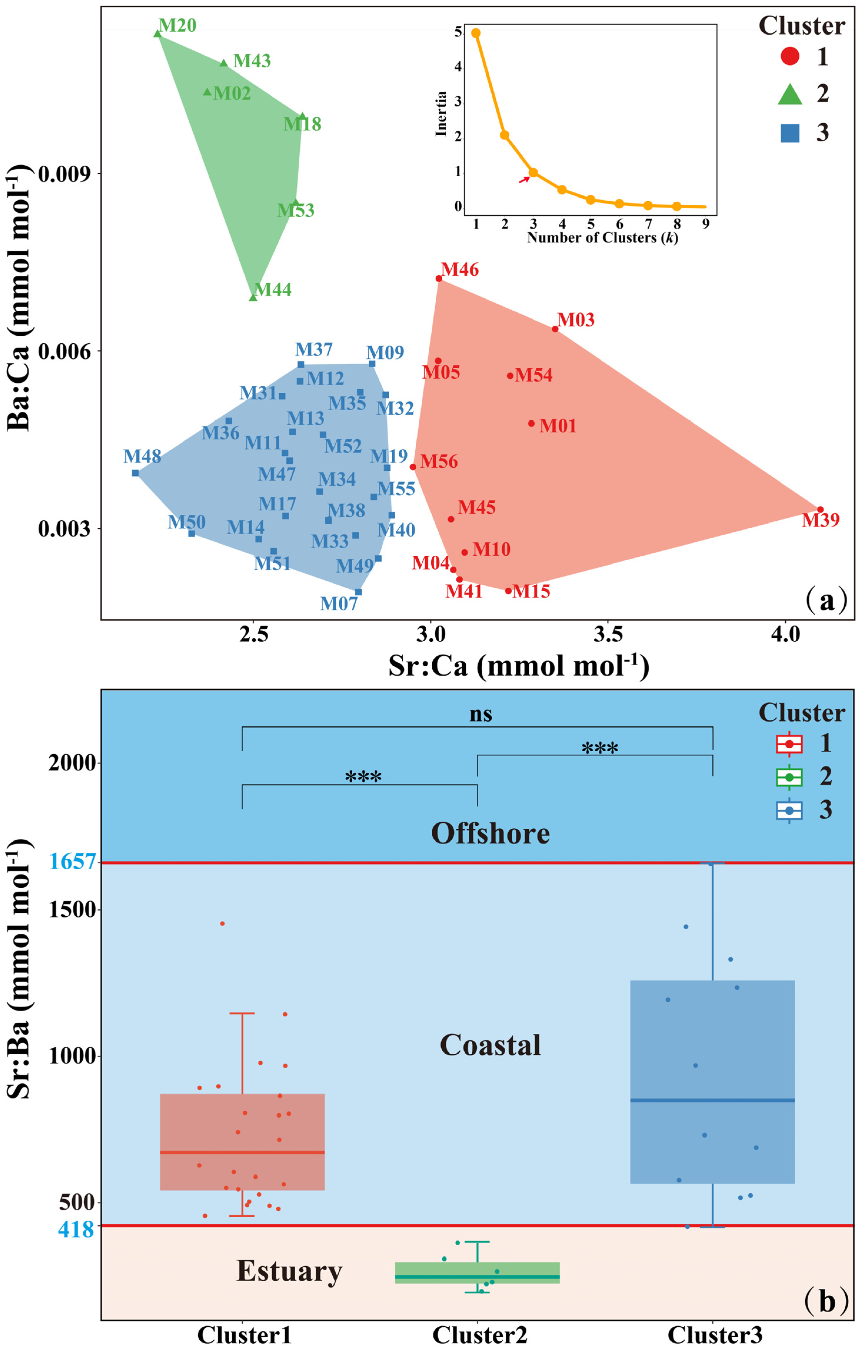 - Use typical tracer elements (Sr:Ca and Ba:Ca) in otolith cores to identify the water chemistry information of natal sources and establish Sr:Ba thresholds from estuary to offshore.