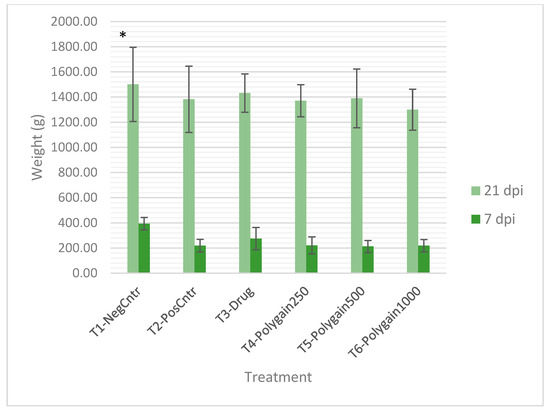 Mean body weight (g) of broilers at 7 and 21 days post-infection (dpi) with Eimeria spp. under different dietary treatments. Values are presented as mean ± SD (n = 12 birds per group). T1-NegCntr = uninfected, untreated negative control; T2-PosCntr = infected, untreated positive control; T3-Drug = infected + nicarbazin and narasin; T4-Polygain250, T5-Polygain500, and T6-Polygain1000 = infected + Polygain™ at 250, 500, or 1000 ppm, respectively. (*) indicates significant differences among treatments at each time point (p < 0.05).