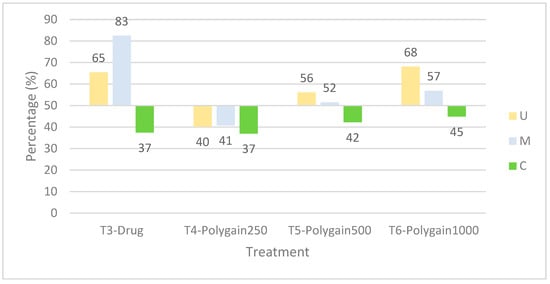 Percentage reduction in lesion scores by intestinal region at 7 days post-infection (dpi). Reductions were calculated for the upper intestine (U), mid-intestine (M), and caecum (C). Data represent mean values per treatment group, T3 = nicarbazin + narasin, T4 = Polygain™ 250 ppm, T5 = Polygain™ 500 ppm, T6 = Polygain™ 1000 ppm). The dashed line at 50% reduction indicates the threshold used to classify Eimeria sensitivity; values > 50% indicate a sensitive response, whereas values ≤ 50% indicate resistance to the treatment.
