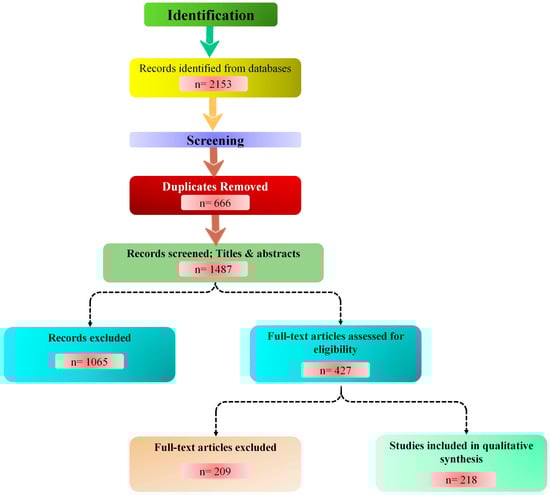 We began with 2153 records, removed 666 duplicates, and screened titles and abstracts of 1487 articles. After assessing 427 full-text papers for eligibility, we included 218 studies. The study selection process is summarized in Figure 2, adhering to PRISMA guidelines. This diagram delineates the identification, screening, eligibility assessment, and inclusion phases, highlighting the exclusion of duplicates and ineligible records (n = 1065).