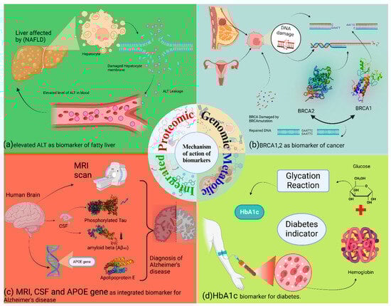 Explain the mechanism of action of different biomarkers. (a) In non-alcoholic fatty liver disease (NAFLD), hepatocyte membrane compromise leads to the release of alanine aminotransferase (ALT) into the bloodstream. Elevated serum ALT serves as a biomarker for liver damage. (b) BRCA1/BRCA2: These genes encode proteins critical for DNA double-strand break repair via homologous recombination. Loss-of-function mutations in BRCA1 or BRCA2 impair this repair pathway, leading to genomic instability and increased cancer risk. (c) Integrated AD biomarkers: Alzheimer’s disease diagnosis employs an integrated approach. MRI detects structural brain changes. Cerebrospinal fluid (CSF) analysis measures altered levels of amyloid-beta and phosphorylated tau proteins. Genetic testing identifies risk alleles, such as in the APOE gene. (d) HbA1c: Hemoglobin A1c is formed through the non-enzymatic glycation of hemoglobin in red blood cells. Its concentration reflects average blood glucose levels over the preceding 2–3 months, making it a stable biomarker for long-term glycemic control in diabetes.
